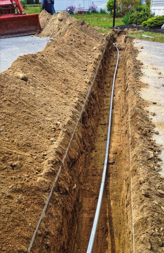 Compliant trenching and electrical-grade conduit installation for underground mains, including proper backfill, warning tape placement, and ground compaction.